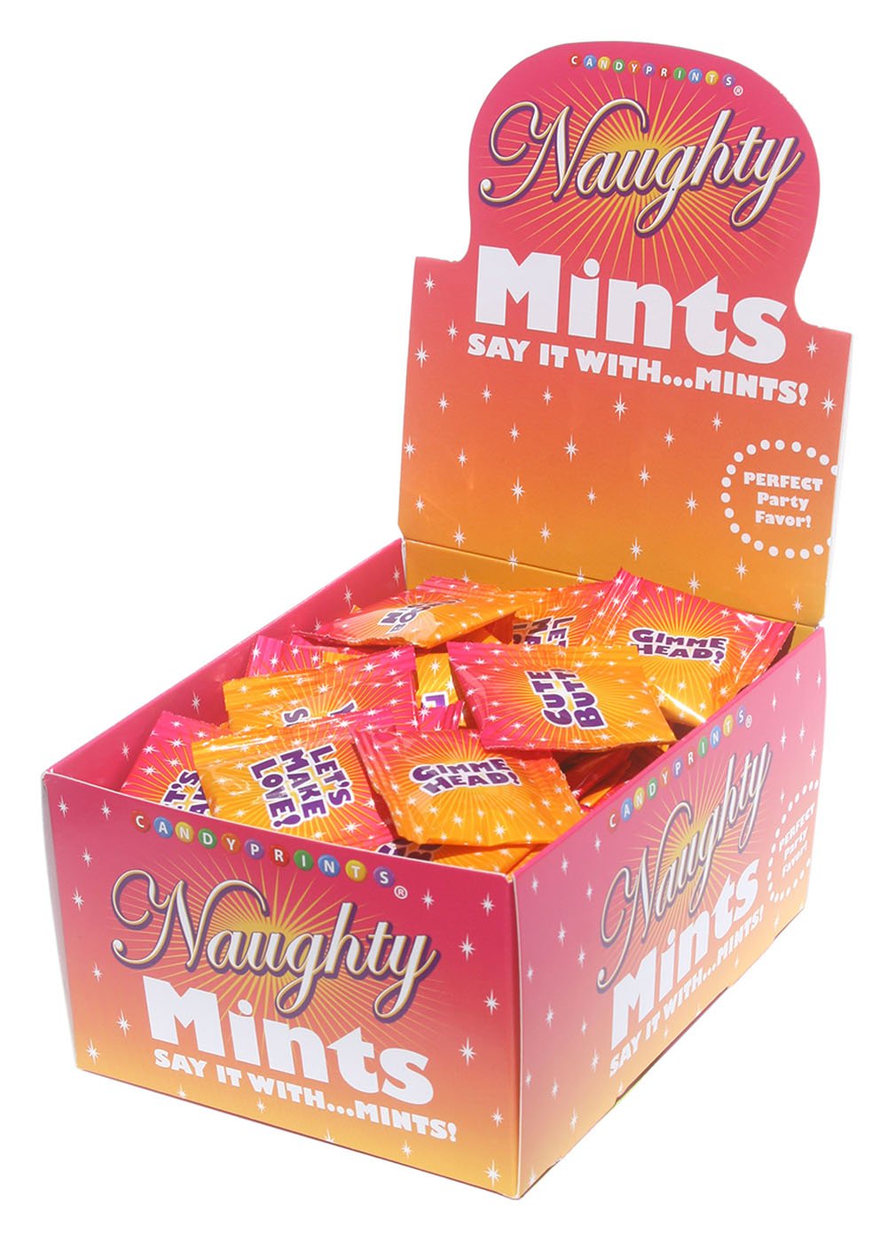 Each carton contains (100) 3.1g bags of peppermint-flavored mint candy. Each bag is printed with a Risque message. There are approximately 3 pcs. of candy per bag.