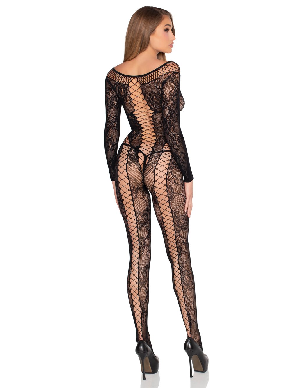 Net and Lace Crotchless Lingerie Jumpsuit – Os – Black