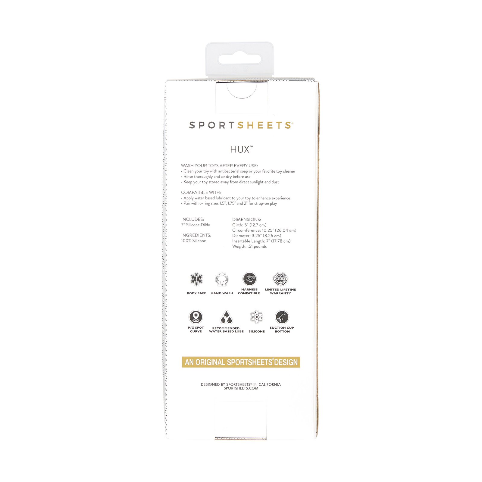 Hux is a phthalate-free, non-porous, hypoallergenic, 7 inch solid silicone dildo with a suction cup base.