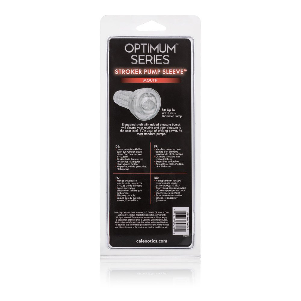 in a some sensational solo play? Whatever youre craving, the Optimum Series Stroker Pump Sleeve is ready to take your pleasure to the next level. This ultra-stretchy, mouth-shaped sleeve has an elongated shaft and rows of stimulating beads for an intense masturbation experience with truly explosive results. The premium sleeve fits into most standard pumps, but can be used independently for a passionate stroking experience. The premium TPR masturbation toy is a body safe, unscented and phthalate free to keep you most sensitive spots, happy and healthy. Enjoy easy clean up with this maintenance free masturbation sleeve, simply wash with soap and warm water before and after each use. Use ample lubricant for easy insertion.