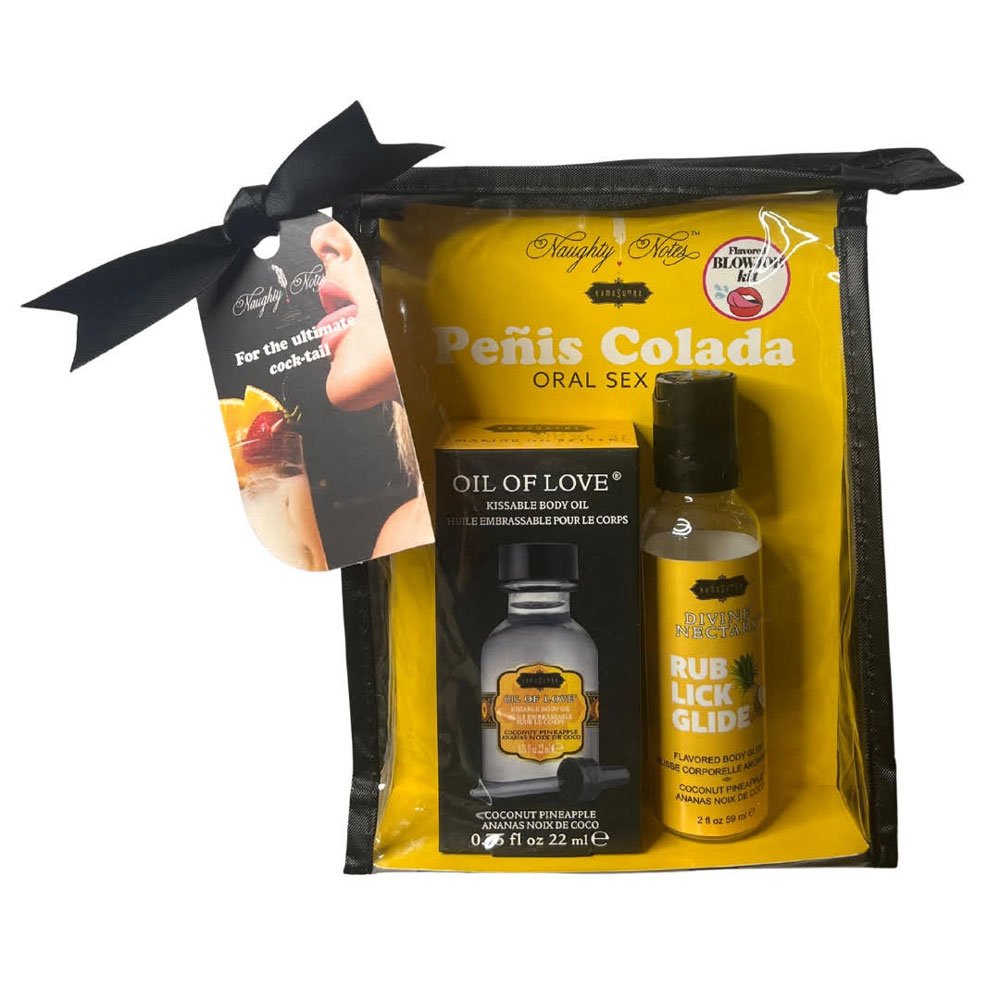 Penis Colada Cocktail Kits, flavored product duos for deliciously fun oral sex. You can choose from 3 juicy flavors inspired by popular cocktails. Oil of love coconut pineapple divine nectars coconut pineapple. Each kit contains a flavored lube, warming body oil, and a divine nectars flavore lube and body glide. Each kit also includes 2 sex positions and a QR code with cocktail recipes!