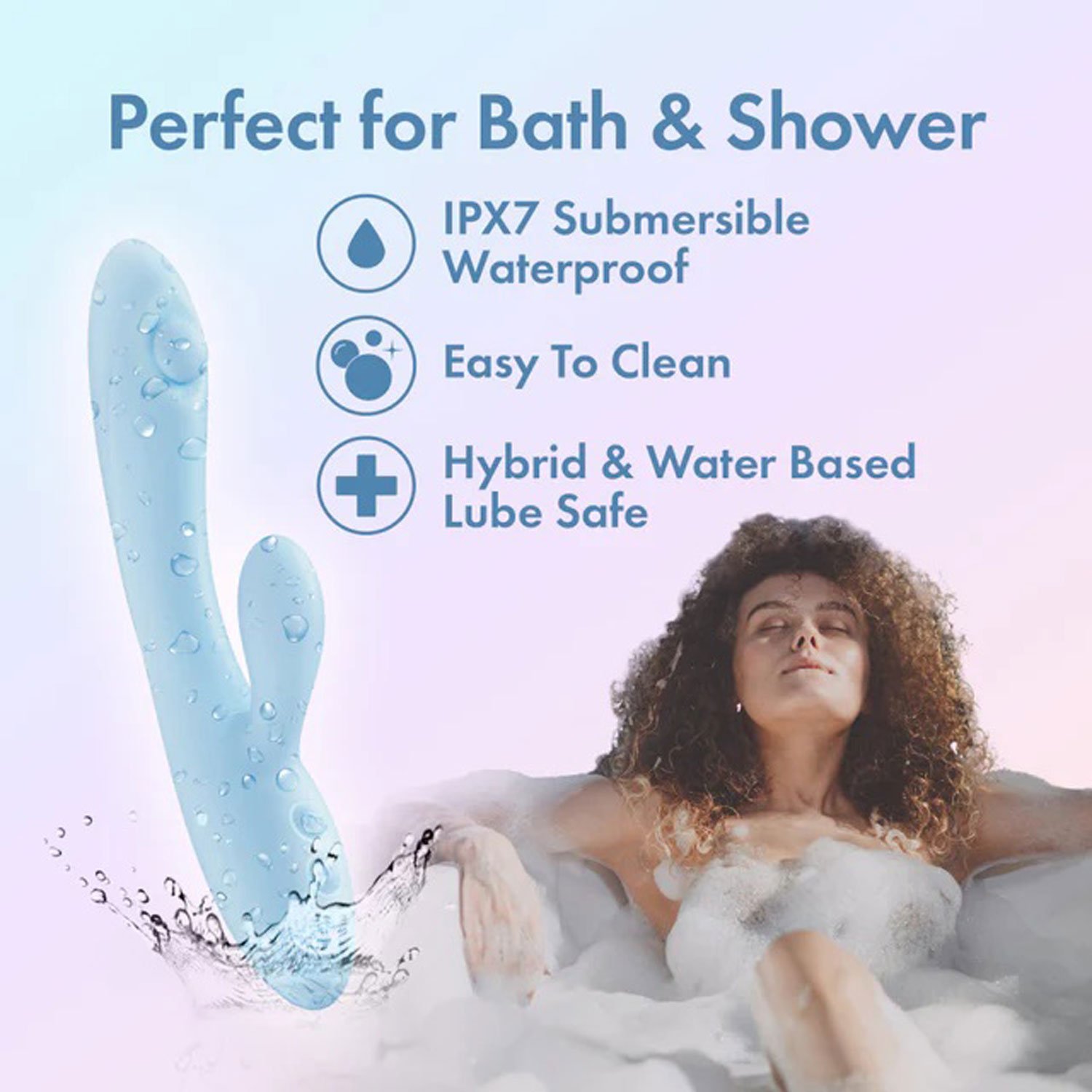 Explore new pleasure with the play with me moondust magic. Elegantly designed, this rabbit massager has a smooth and curved flexible shaft that contours to all your pleasure points effortlessly. Experience deep satisfaction with customizable vibration settings, between your erogenous zones. Moondust magics come-hither technology caresses your g-spot, providing the ultimate blend of internal and external sensations. Moondust Magic is made with 100% body-safe, platinum cured silicone that is satin smooth to the touch, non- porous, and easy to clean. With its IPX7 waterproof feature, you can use this vibrator in the bath or shower for enhanced play without limitations. Enjoy 75 minutes of sustained pleasure with fast and effective magnetic USB charging. Get ready to explore a world of unforgettable cosmic climaxes with your lunar lover.
