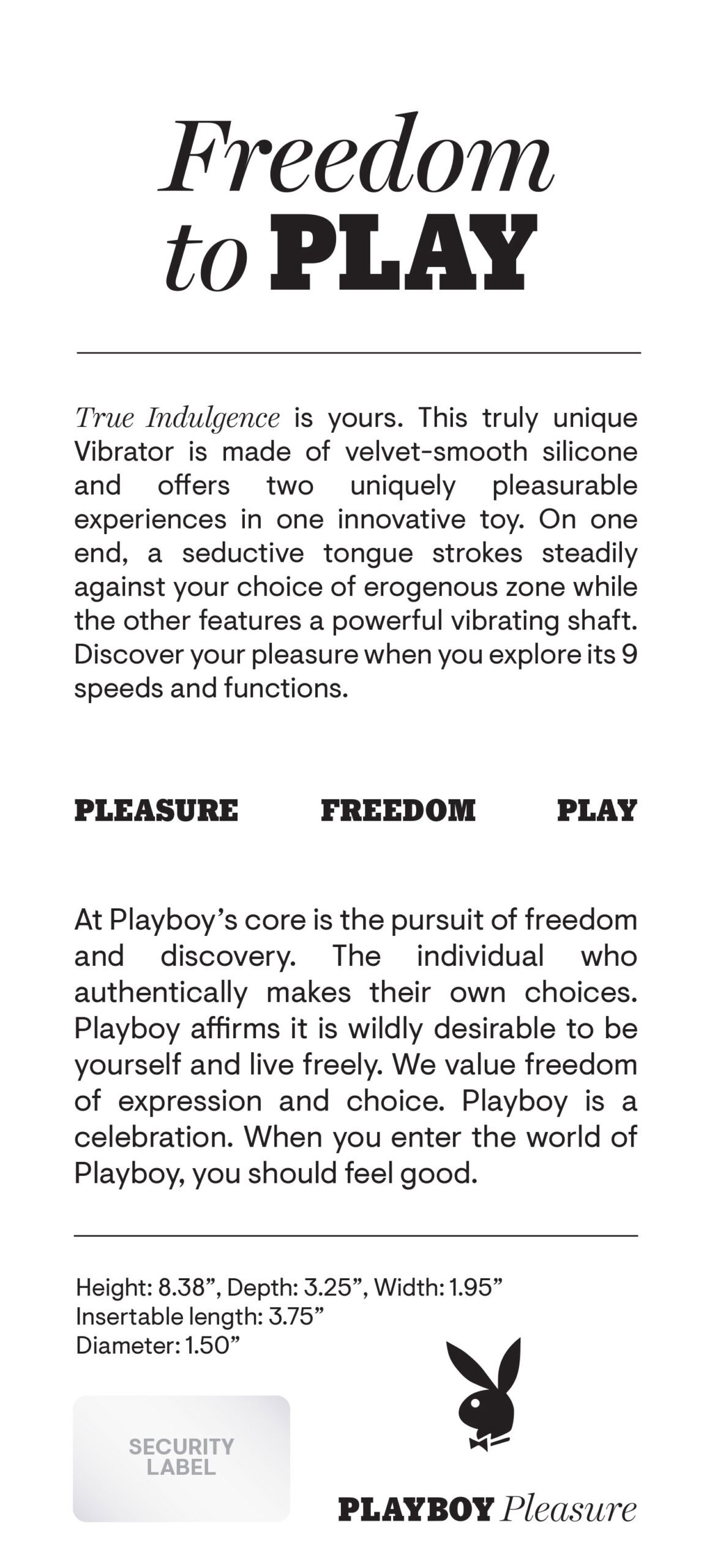 True Indulgence is yours. This truly unique Vibrator is made of velvet-smooth silicone and offers two uniquely pleasurable experiences in one innovative toy. On one end, a seductive tongue strokes steadily against your choice of erogenous zone while the other features a powerful vibrating shaft. Discover your pleasure when you explore its 9 speeds and functions.