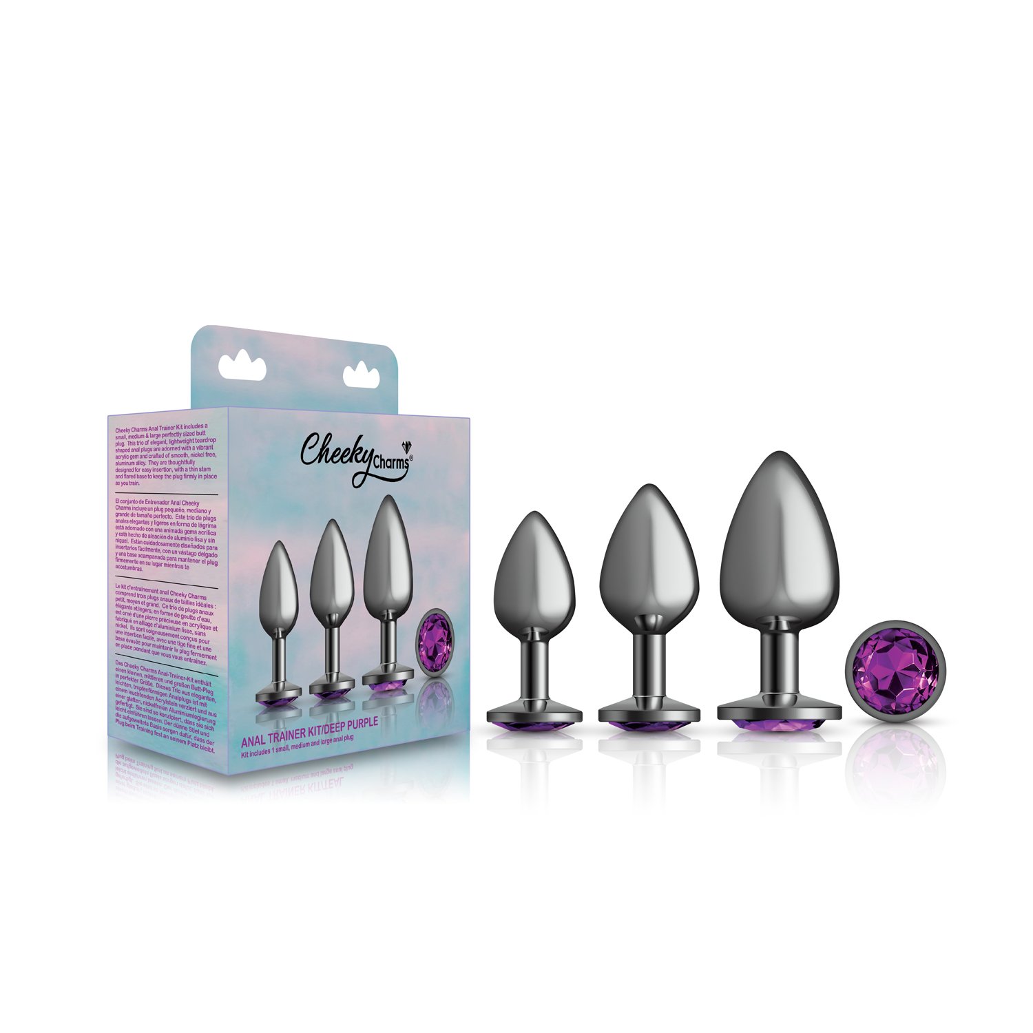 Anal Trainer Kit features one of each, a small, medium and large gunmetal, teardrop shaped anal plug adorned with a vibrant acrylic gemstone available in three colors, a sparkling deep purple, tempting teal and brand new deep red. The plugs are hypoallergenic, and made of a nonporous, body safe, nickel free, aluminum alloy. Both the plug and the acrylic anal jewelry, compatible with all lubricants. They are easy to clean and dishwasher safe butt plugs.
