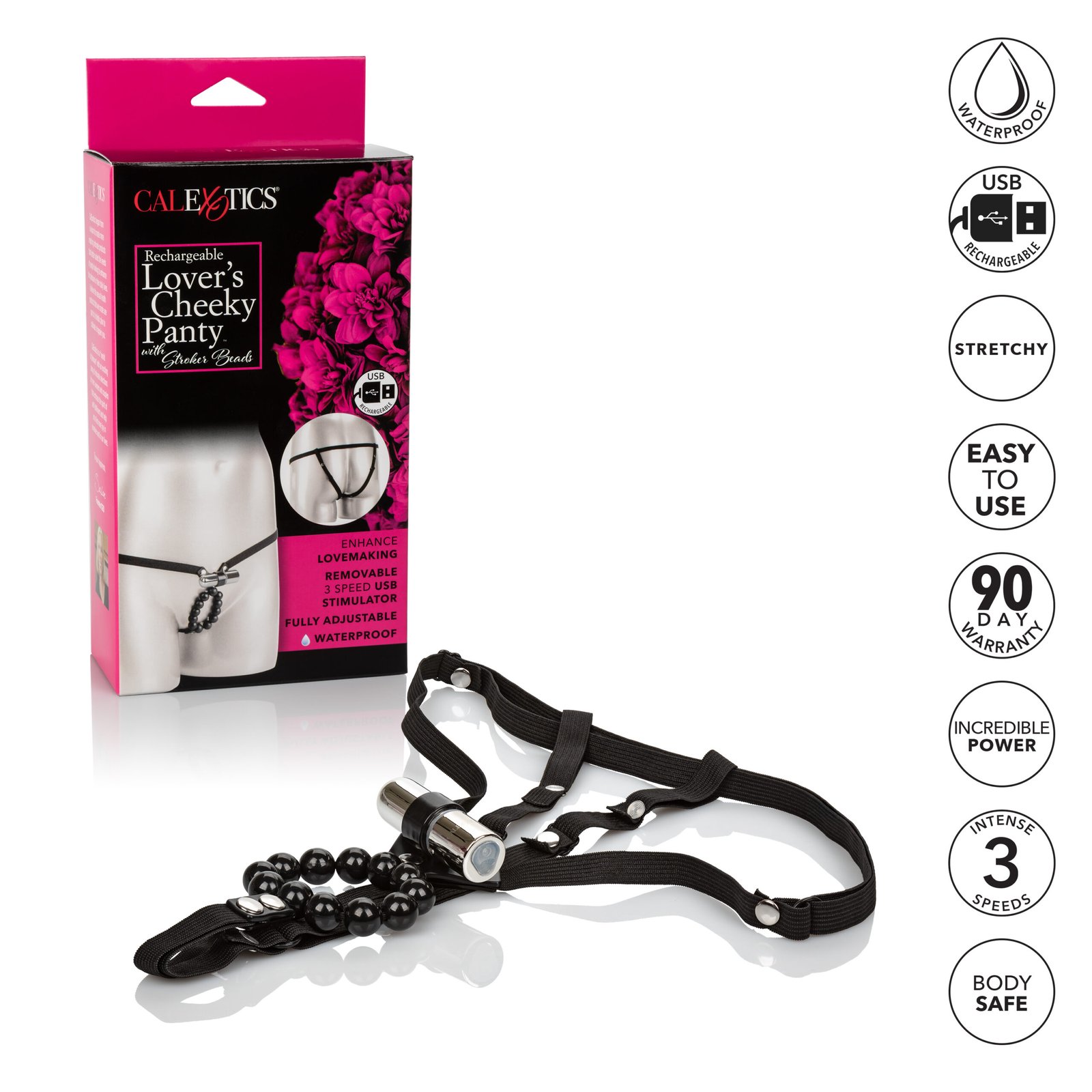 Fall in love with intense stimulation with the couples-friendly Rechargeable Silicone Lover’s Thong with Pleasure Beads. Tease and tantalize external sweet spots with the thrilling stroker beads, sexy thong harness design and powerful 3-speed bullet massager. The rechargeable bullet can be used independently from the stroker panties for mind-blowing stimulation. The ravishing roller beads are designed to hug your most intimate curves for sensational couples stimulation. While the pleasure beads give her tantalizing external stimulation, he will adore the intense shaft stroking pleasure.
