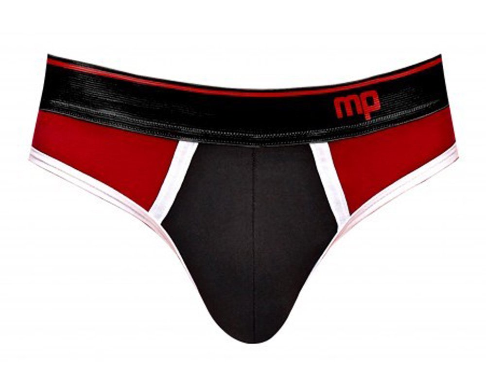 From the Retro Sport collection by Male Power, this style includes: a panel jock with color blocked fabric inserts accented with white trim and stripes, plush elastic waist band with MP logo, and wide leg bands for butt lifting support.