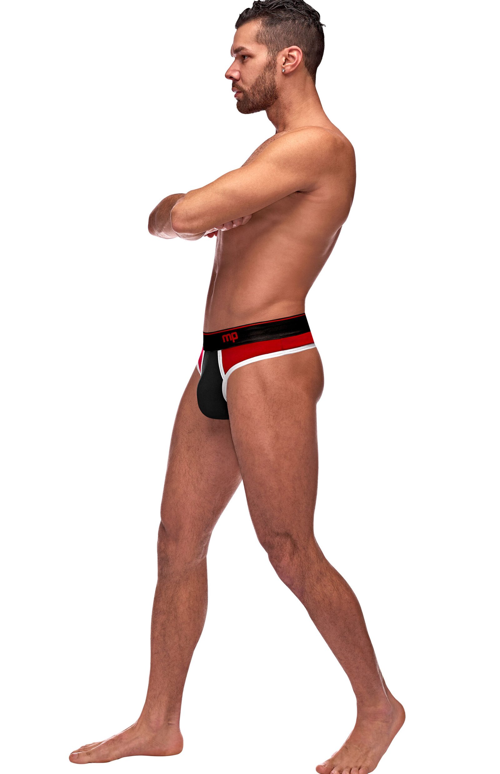 From the Retro Sport collection by Male Power, this style includes: A panel thong with color blocked fabric inserts, with white trim and stripes, and a plush elastic waist band with MP logo.