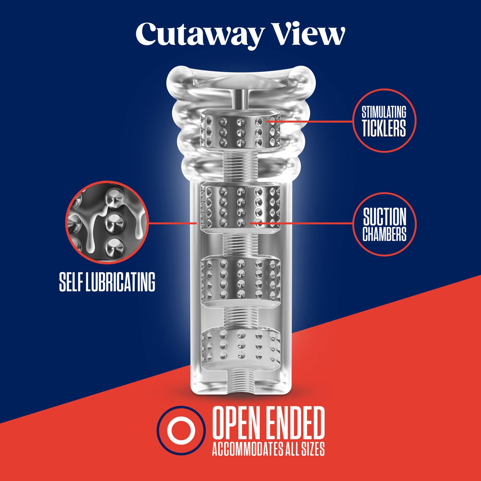 The RIZE! Luz is loaded with fun! This stroker is self-lubricating, just add a little water or saliva, and everything gets slippery. It also glows blue in the dark to add some excitement to your night! The Luz has soft ticklers for the ultimate feel and a ribbed inside for pressure point massage. Multiple chambers of suction create pleasurable stroking sensations. Super-soft and flexible, the Luz will fit any size shaft. It is free of phthalates, fragrances, paraffins, and latex.