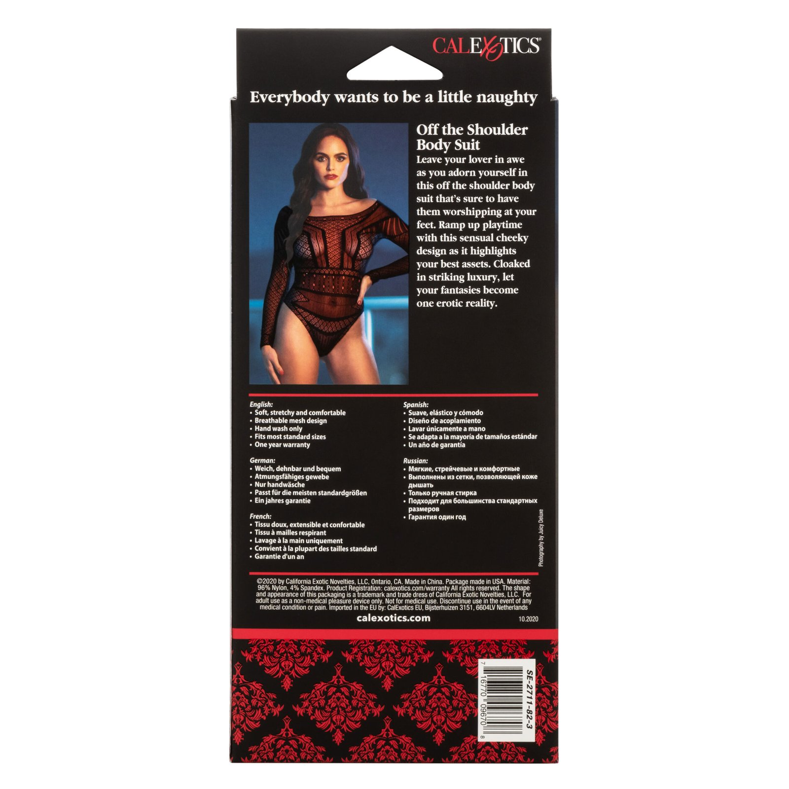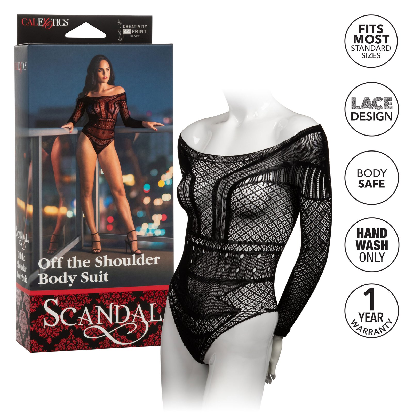 The Scandal Off the Shoulder Body Suit is full-body playwear that is sure to start the steamy night you desire. With an off-the-shoulder, cheeky design, this outfit frames your body in a steamy, sensual fashion. Embrace your wild side with a look that will have your partner worshiping at your feet. This nylon-spandex blend is designed to hug the wearer to provide exceptional, explicit eroticism with a playful smile or a dominant smirk of confidence. Scandal Off the Shoulder Body Suit is a great surprise as a gift to yourself, or for your lover which is sure to add the spice to the bedroom that you are looking for. This breathable mesh lace outfit is designed to stretch over the body and hug your curves, providing a comfortable fit for most standard sizes, and is hand-washable to ensure a long lifetime of repeated fun.