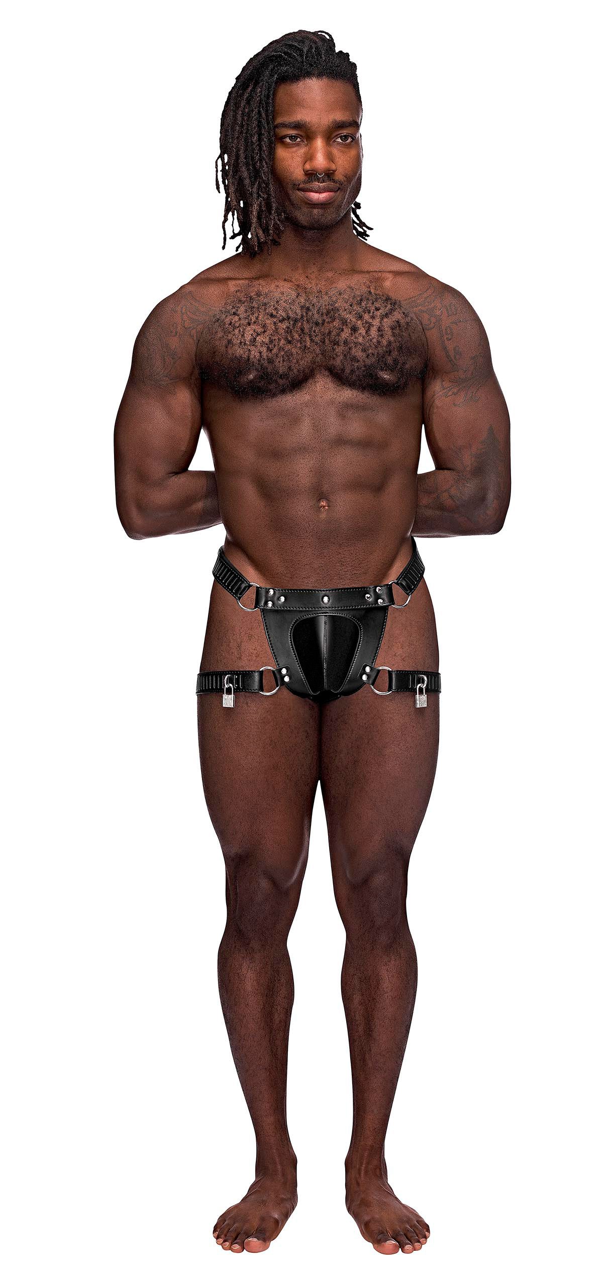 Scorpio Chastity Thong features adjustable waist, leg, and t-back straps secured with locks & keys. Soft stretch leather pouch and attached heavy metal rings.