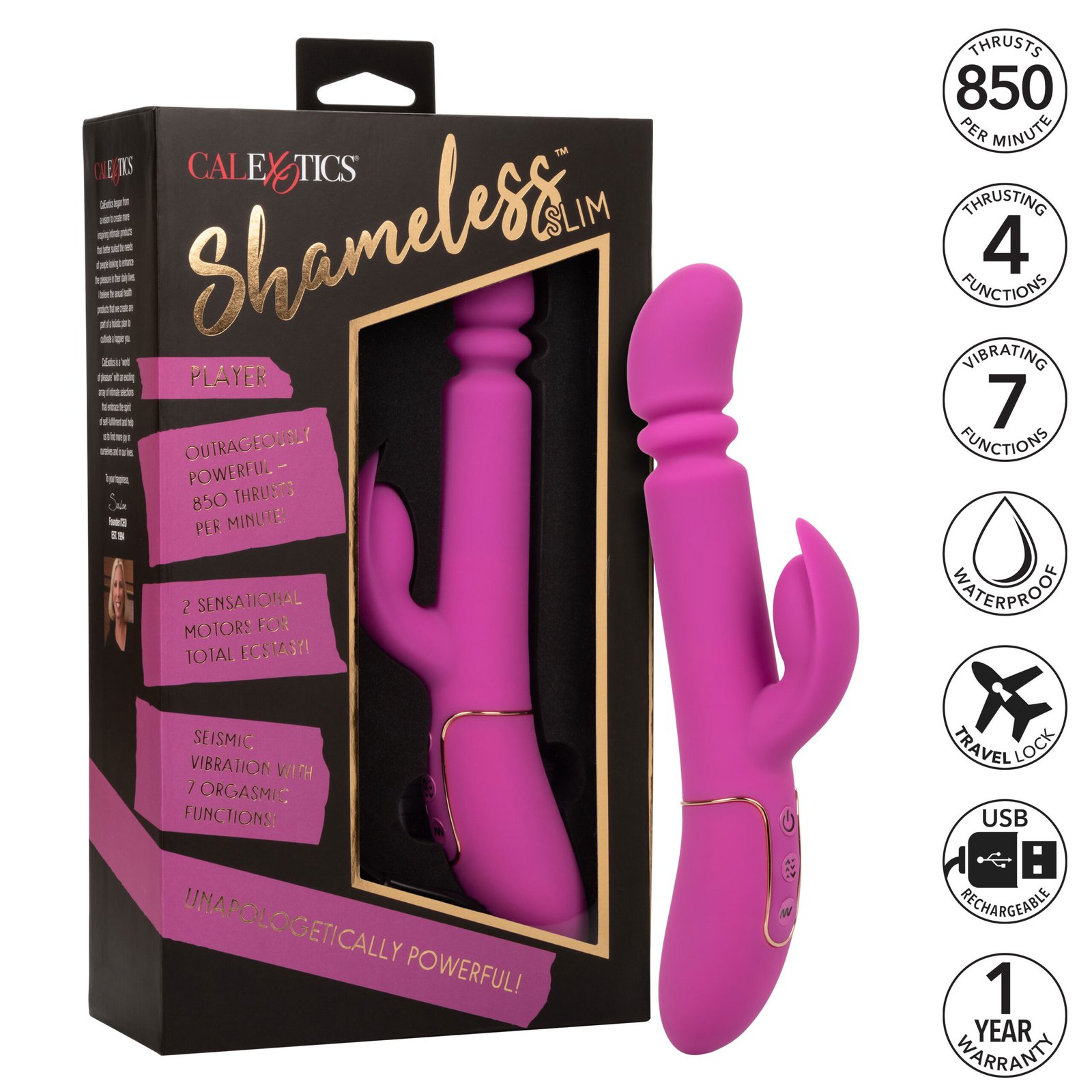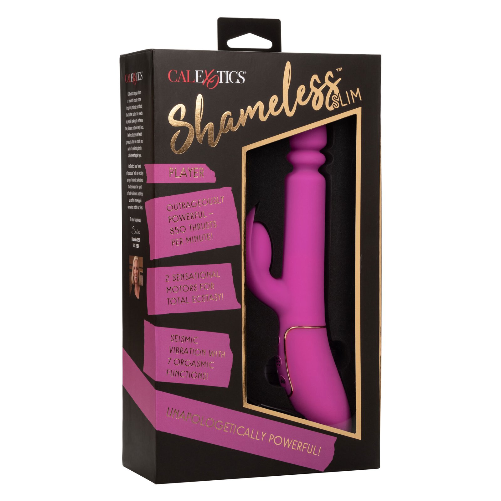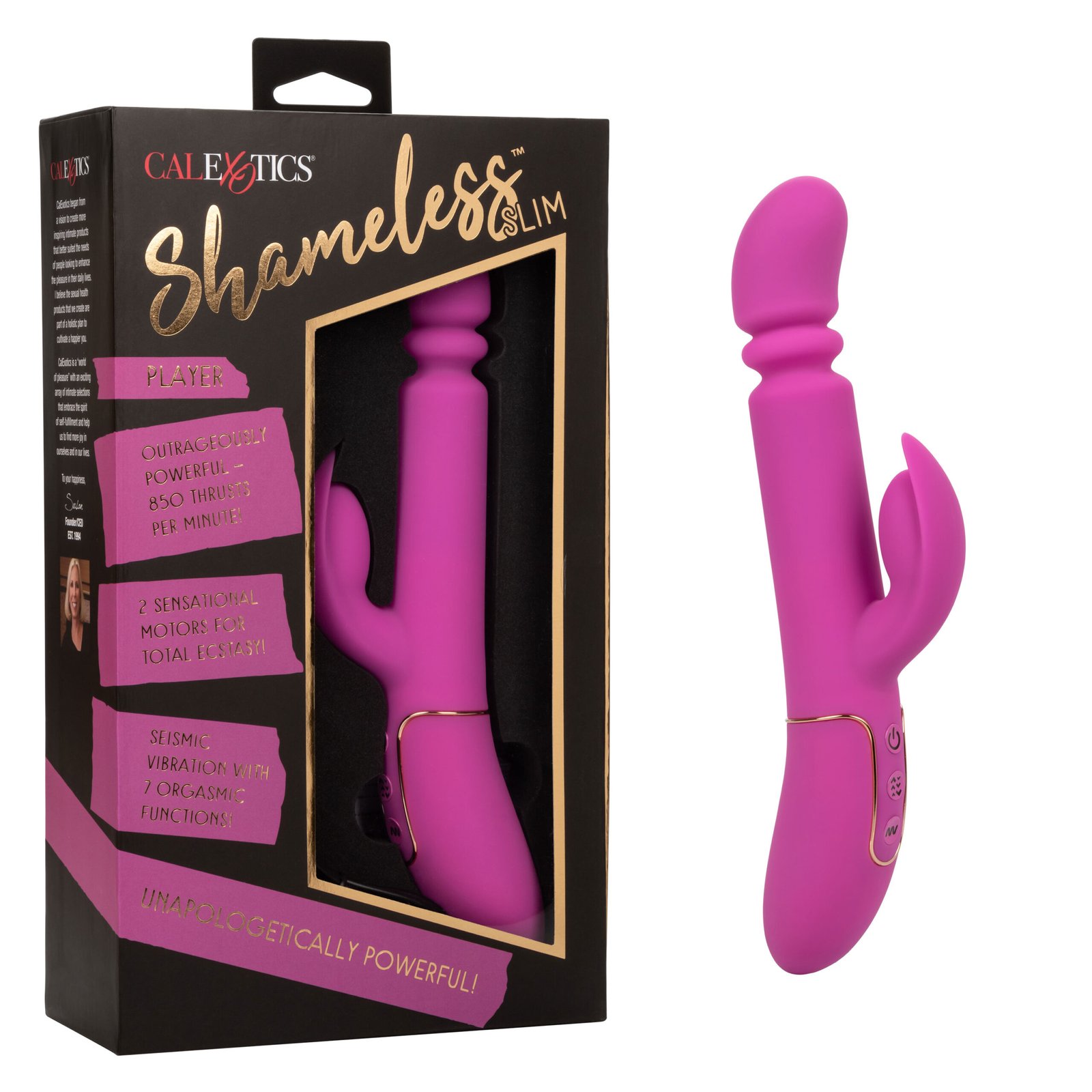 The power of a sex machine in the palm of your hand – now that’s Shameless! This luxury massager is unapologetically powerful with up to 850 thrusts per minute and a vibrating stimulator that will blow your mind. With a sexy, slim shaft, this sensational vibe has it all.