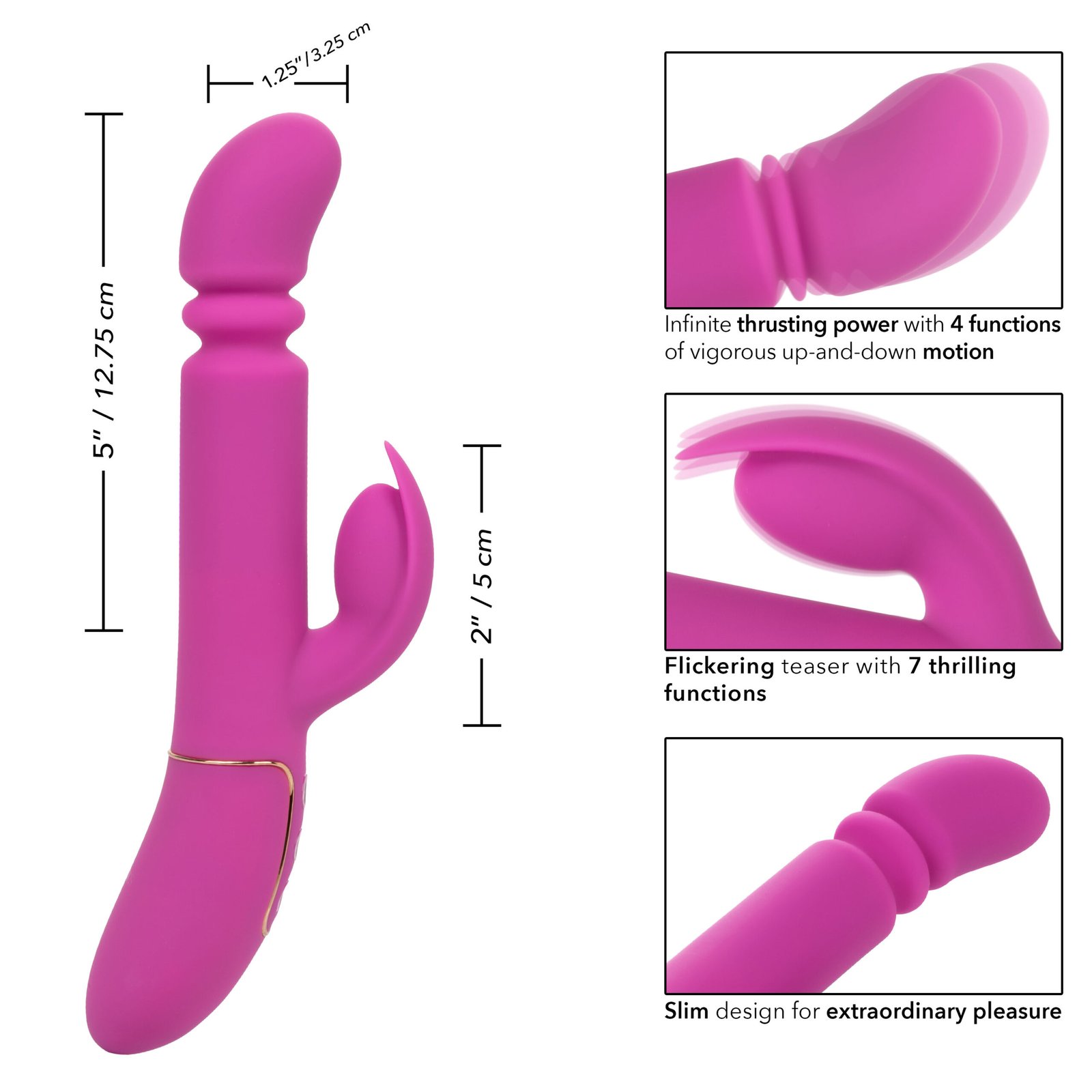 Escalates ,Multi-Function ,Phthalate Free ,Pulsates ,Rabbit Style ,Rechargable ,Thrusts ,Vibrates ,Waterproof |