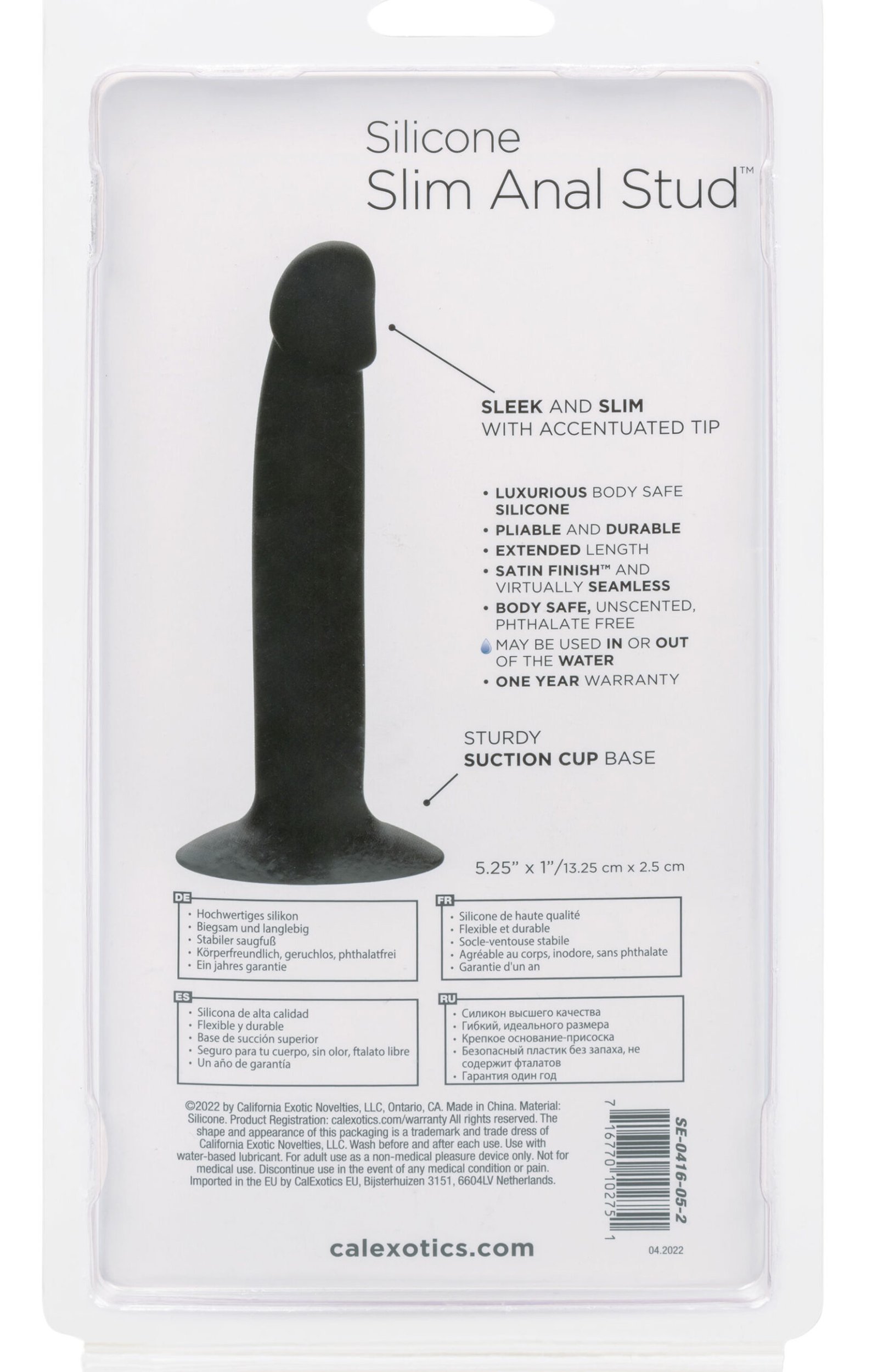 From bashful beginner to erotic expert, the CalExotics Silicone Slim Anal Stud is sure to thrill any backdoor pleasure seekers. The virtually seamless silicone probe has a sleek slim shaft, accentuated head, and powerful suction cup base. The gently curved tip and flexible design are sure to hit just the right spot every time. The flanged base has a sturdy suction cup that can be used in a harness or mounted to a flat surface for sensational hands-free fun. The flexible probe is made from a smooth, seamless silicone. The body safe material is unscented and phthalate free to keep your most sensitive spots happy and healthy.