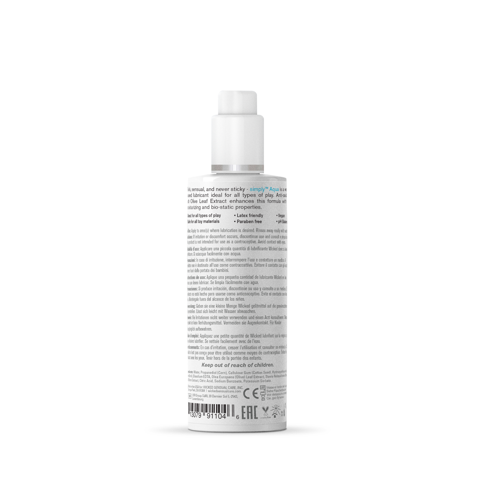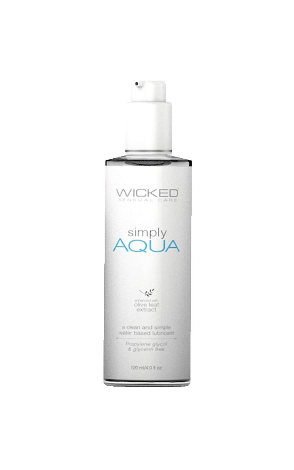 Heighten sensation and increase pleasure with Simply Aqua, a clean, pH balanced water based lubricant that’s slick, sensual, and never sticky. Free of Glycerin, Propylene Glycol, and Parabens, Simply Aqua is also vegan, cruelty- free, and enhanced with Wicked’s signature antioxidant-rich Olive Leaf Extract for its moisturizing and biostatic properties. When you want a clean lube…do it simply.