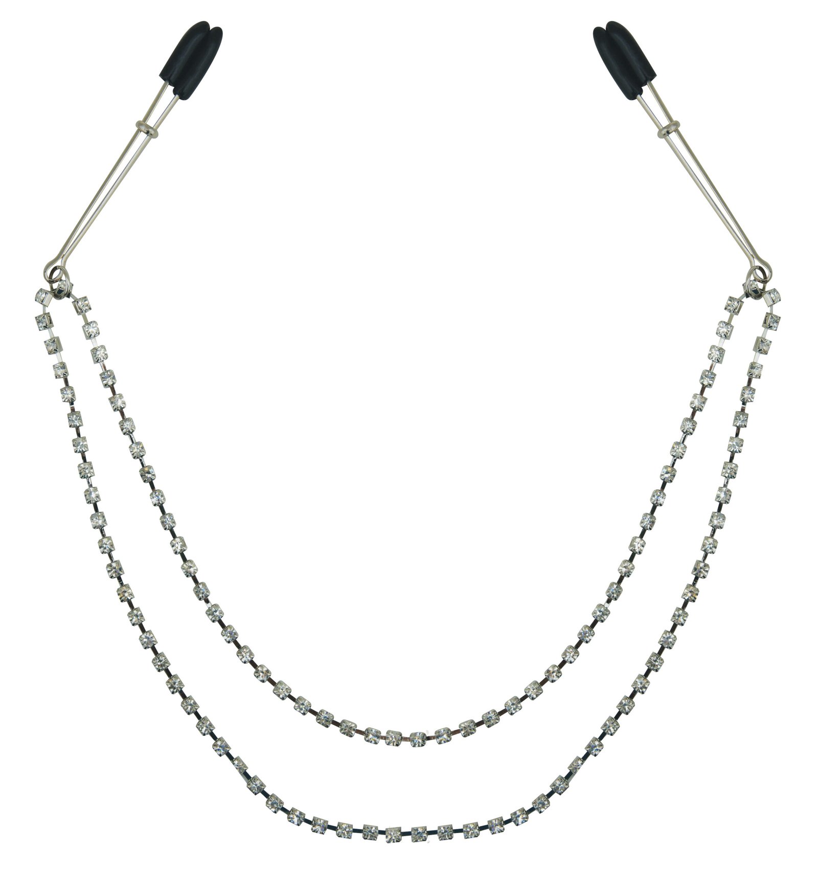 This 20 inch (50.8cm) doubled strand of sparkling bling will give you a formal feeling while the rubber-tipped nipple clips serve as a constant reminder that all are entitled to feeling a little pain with their pleasure.
