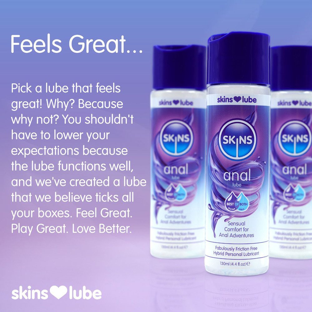 When it comes to back door adventures theres no such thing as too much lube. With no lubrication of its own, this area calls for a slightly thicker and more slippery lube. Enter Skins Anal for fabulously friction free fun. Skins Anal is a hybrid lube combining the natural look and feel of a water-based lube with with the added slip, luxury and longevity of silicone.