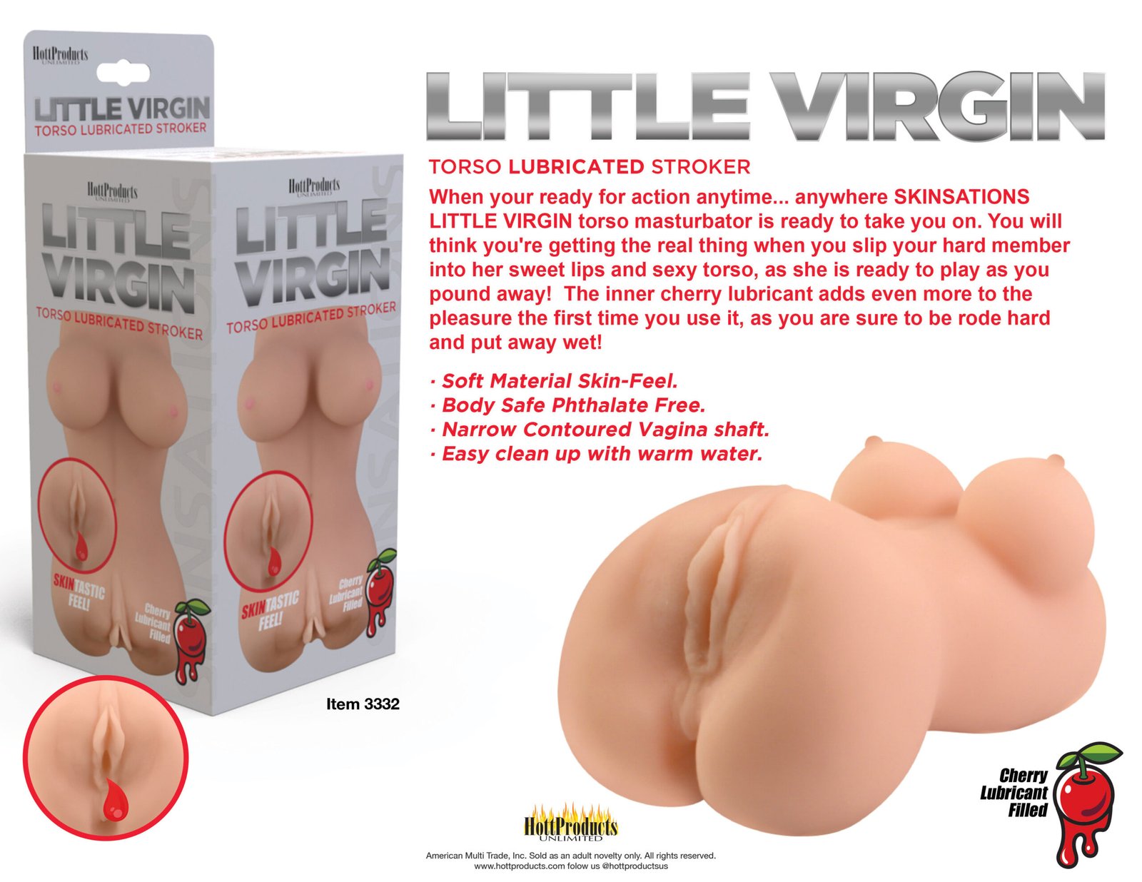When your ready for action anytime… anywhere SKINSATIONS LITTLE VIRGIN torso masturbator is ready to take you on. You will think you’re getting the real thing when you slip your hard member into her sweet lips and sexy torso, as she is ready to play as you pound away! The inner cherry lubricant adds even more to the pleasure the first time you use it, as you are sure to be rode hard and and put away wet!