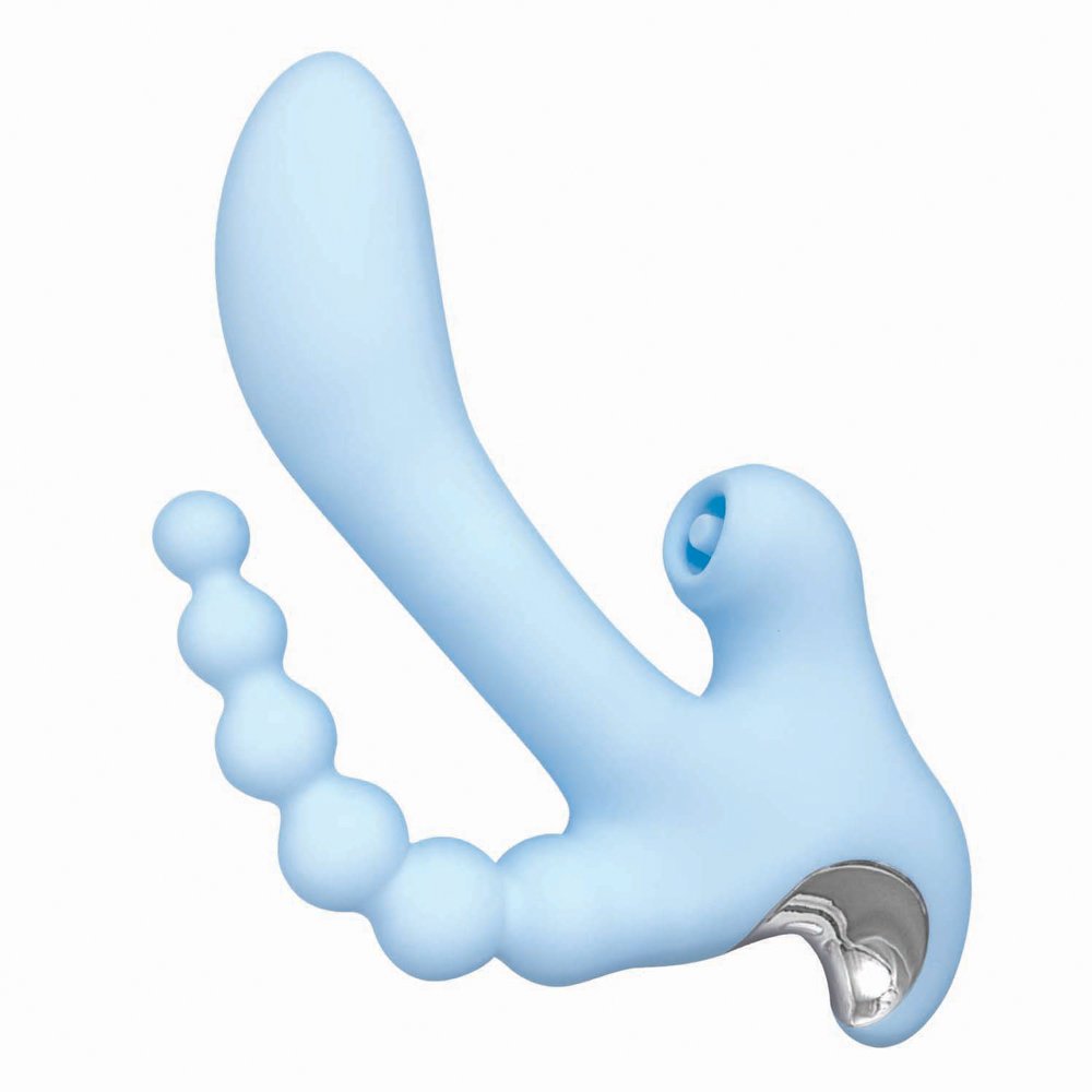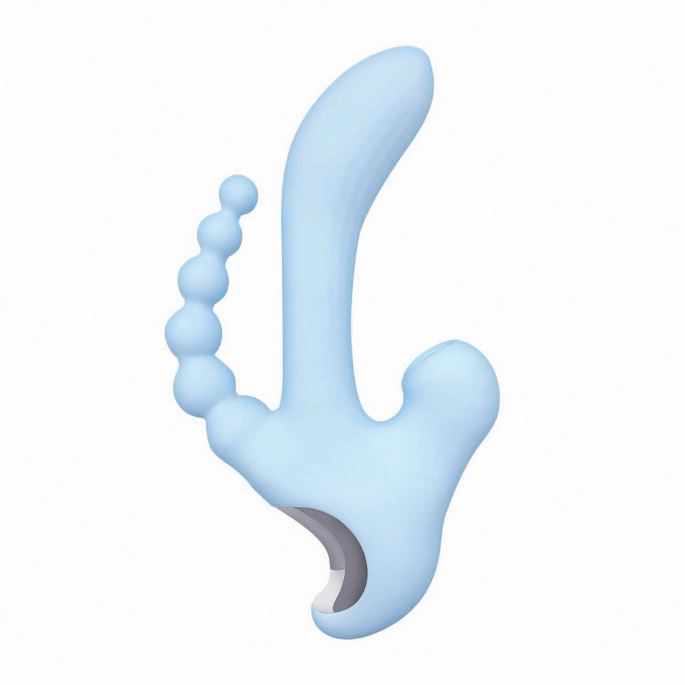 Meet the Nasstoys Sky Cirrus Three Way Vibe, a thoughtfully designed pleasure tool made for layered stimulation and playful exploration. This USB rechargeable vibe features dual motors and 10 vibration functions, giving you a powerful yet controlled sensation across multiple points at once. The ergonomic curved shape makes insertion easy and comfortable, with a bulbous internal tip that is well-suited for G-spot stimulation. An integrated anal bead stimulator adds another dimension of sensation, making this a great option for users who enjoy experimenting with new feelings and combinations. The Sky Cirrus also includes a tapping external stimulator set inside a soft cup that surrounds the clitoris for consistent contact and rhythmic sensation. Wrapped in silky smooth body-safe silicone, it is quiet, powerful, and splash proof for easy cleanup. For best performance, charge fully before first use to help prime the battery, and pair with a water-based lubricant to enhance comfort and sensation. After play, clean with toy cleaner or mild antibacterial hand soap, rinse thoroughly, and allow to dry completely before storing. Designed for versatility and confidence, this three-way vibe invites curiosity and creativity into every session.