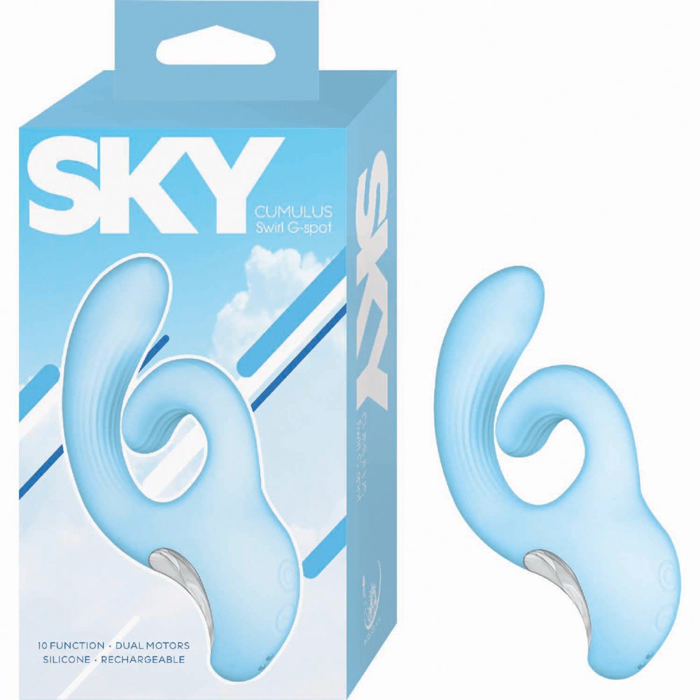 Meet the Nasstoys Sky Cumulus Swirl G Spot, a thoughtfully designed vibe made for powerful blended stimulation and comfortable exploration. This USB rechargeable toy features 10 vibration functions powered by dual motors, delivering targeted sensation where you want it most. The ergonomic, curved shape is easy to insert and positions the bulbous head perfectly for G-spot or P-spot stimulation, while remaining backdoor safe for confident use. Its versatile design keeps consistent external contact, making it ideal for users who enjoy internal stimulation paired with steady clitoral vibration, even during more active play. Wrapped in silky smooth, body-safe silicone, the Sky Cumulus Swirl G Spot is quiet, powerful, and splash-proof for easy cleanup. For the best experience, use a water-based lubricant to enhance comfort and sensation, and charge fully before first use to help prime the battery for optimal performance. After each session, clean with toy cleaner or mild antibacterial hand soap, rinse thoroughly, and allow to dry before storing. With its flexible design and reliable performance, this vibe is a great option for anyone looking to explore blended pleasure with ease and control.