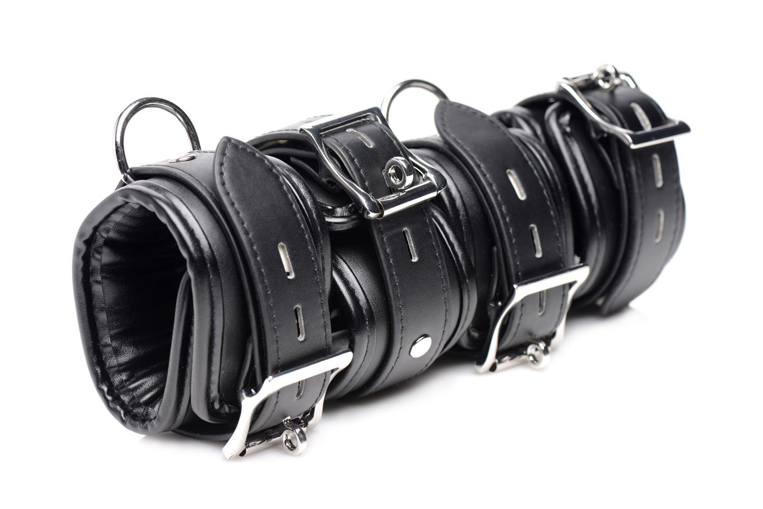 Limit your slaves mobility and remind them of your total control with an attractive and comfortable shackle set. The leather-like collar and 4 cuffs feature internal padding, adjustability, and locking buckles. All five accessories are connected via their D-rings and swiveling clasps to a series of chains to create a full-body restraint. Privately appreciate or show off your plaything in beautiful bondage when you keep them on their feet or force them on all fours.