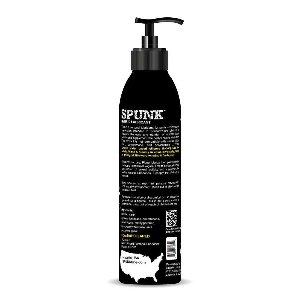 SPUNK Lube Hybrid is a multi-award winning water based silicone lubricant that resembles the look and feel of natural body lubrication (cum lube). It lets you feel the sensation of skin to skin contact. SPUNK Lube Hybrid is a non staining, hypoallergenic formula that cleans up very easily. It’s white, creamy and fun to use. SPUNK Lube Hybrid is not sticky, tacky or greasy. It’s perfect for anal, vaginal, masturbation, solo, sex, toys, condoms & more. SPUNK Lube Hybrid is formulated with the highest quality of ingredients. It will leave your skin feeling soft and smooth.