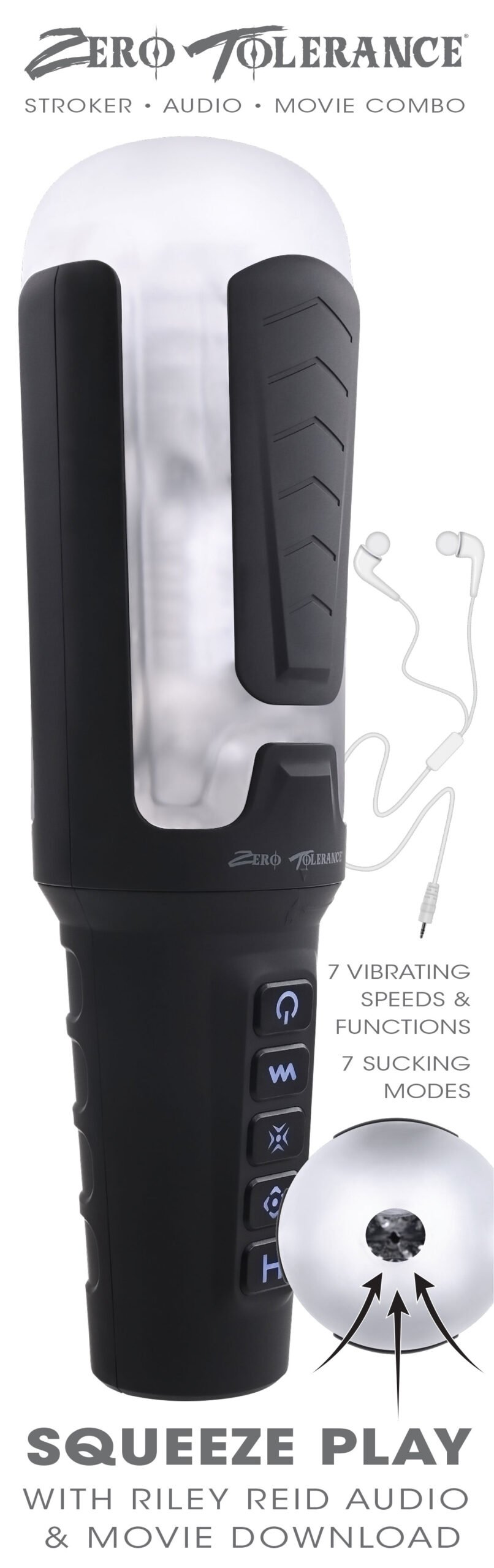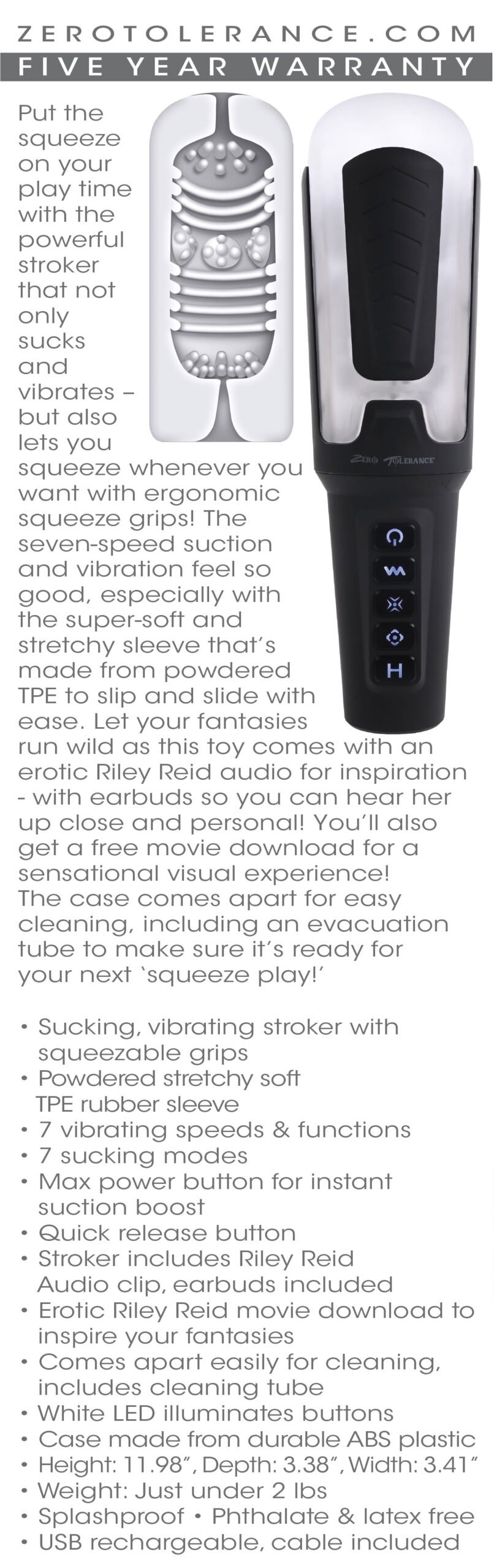 Put the squeeze on your play time with the powerful stroker that not only sucks and vibrates but also lets you squeeze whenever you want with ergonomic squeeze grips! The seven-speed suction and vibration feel so good, especially with the super-soft and stretchy sleeve thats made from powdered TPE to slip and slide with ease. Let your fantasies run wild as this toy comes with an erotic Riley Reid audio for inspiration – with earbuds so you can hear her up close and personal! Youll also get a free movie download for a sensational visual experience! The case comes apart for easy cleaning, including an evacuation tube to make sure its ready for your next squeeze play!