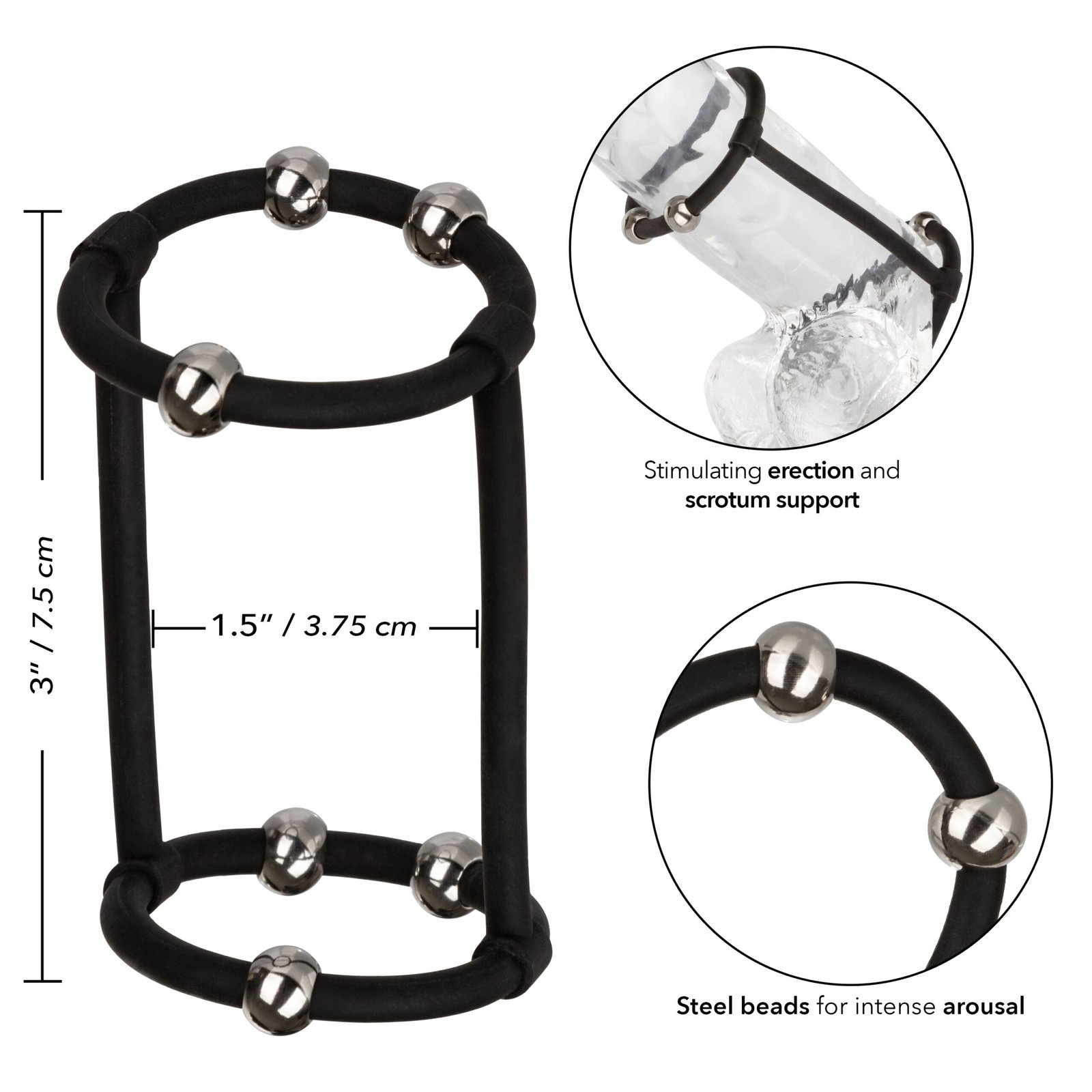 The ultra-stretchy dual erection support ring is sure to enhance pleasure by increasing stamina, sensitivity, and girth. Look forward to an explosive pleasure experience with every teasing stroke of the steal pleasure beads with adjustable and moveable placement. This strong, supportive ring cage indulges your man with increased stamina, girth, and sensitivity, while you can savor his increased stamina and girth, the thrilling stimulation beads tease you towards an orgasmic wonderland.