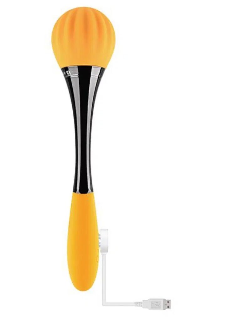 Two powerful motors in one stylish double-ended vibe! Treat yourself to this two-faced robust machine with a textured round wand head on one end – and a long, thin oval head on the other. Let the ball roll and rumble wherever feels good and use the slender oar for more targeted vibrations. Motors are controlled separately and feature 10 speeds and vibrations each, with an easy to use 2-button control that lights up for visibility, even under water as this toy is completely submersible. Rechargeable, latex free and easy to clean.