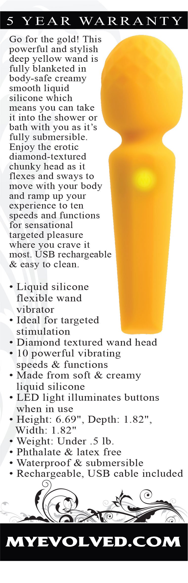 Go for the gold! This powerful and stylish deep yellow wand is fully blanketed in body-safe creamy smooth liquid silicone which means you can take it into the shower or bath with you as its fully submersible. Enjoy the erotic diamond-textured chunky head as it flexes and sways to move with your body and ramp up your experience to ten speeds and functions for sensational targeted pleasure where you crave it most. USB rechargeable and easy to clean.