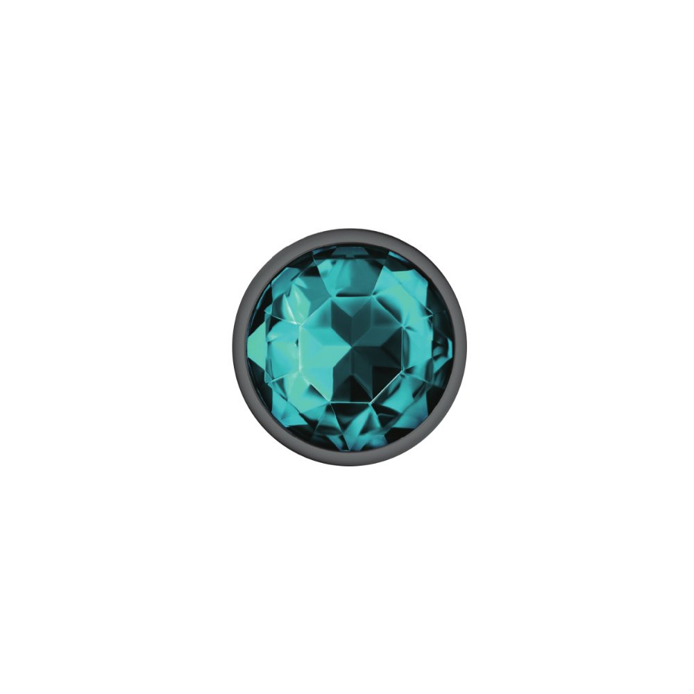 Small, gunmetal, teardrop shaped anal plug with sparkling teal colored, round acrylic gemstone. Hypoallergenic, nonporous, body safe, nickel free, aluminum alloy, anal jewelry compatible with all lubricants. Easy to clean and dishwasher safe butt plugs.