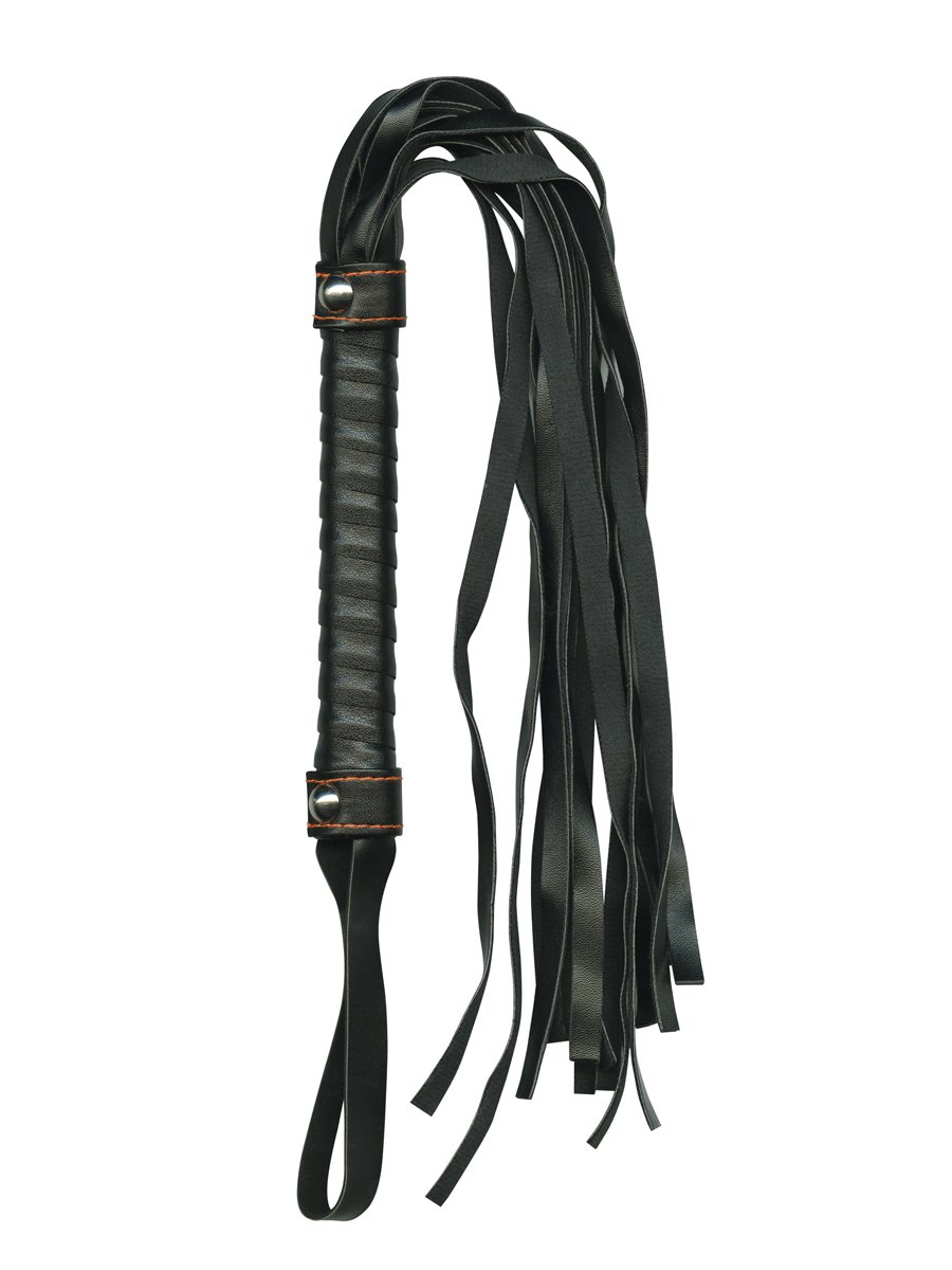 Wonderfully-sized flogger with leather-like strands and strong, sturdy handle. Sexy orange-stitched accents add a touch of fashion and intrigue…and there’s even a handy strap for easy carrying.