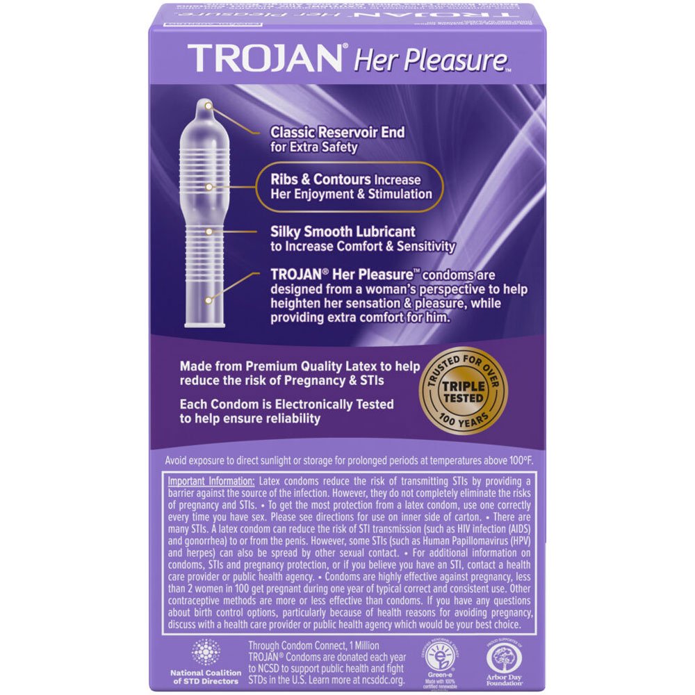 Trojan Her Pleasure condoms are designed from a woman’s perspective to help heighten her sensation and pleasure while providing extra comfort for men.