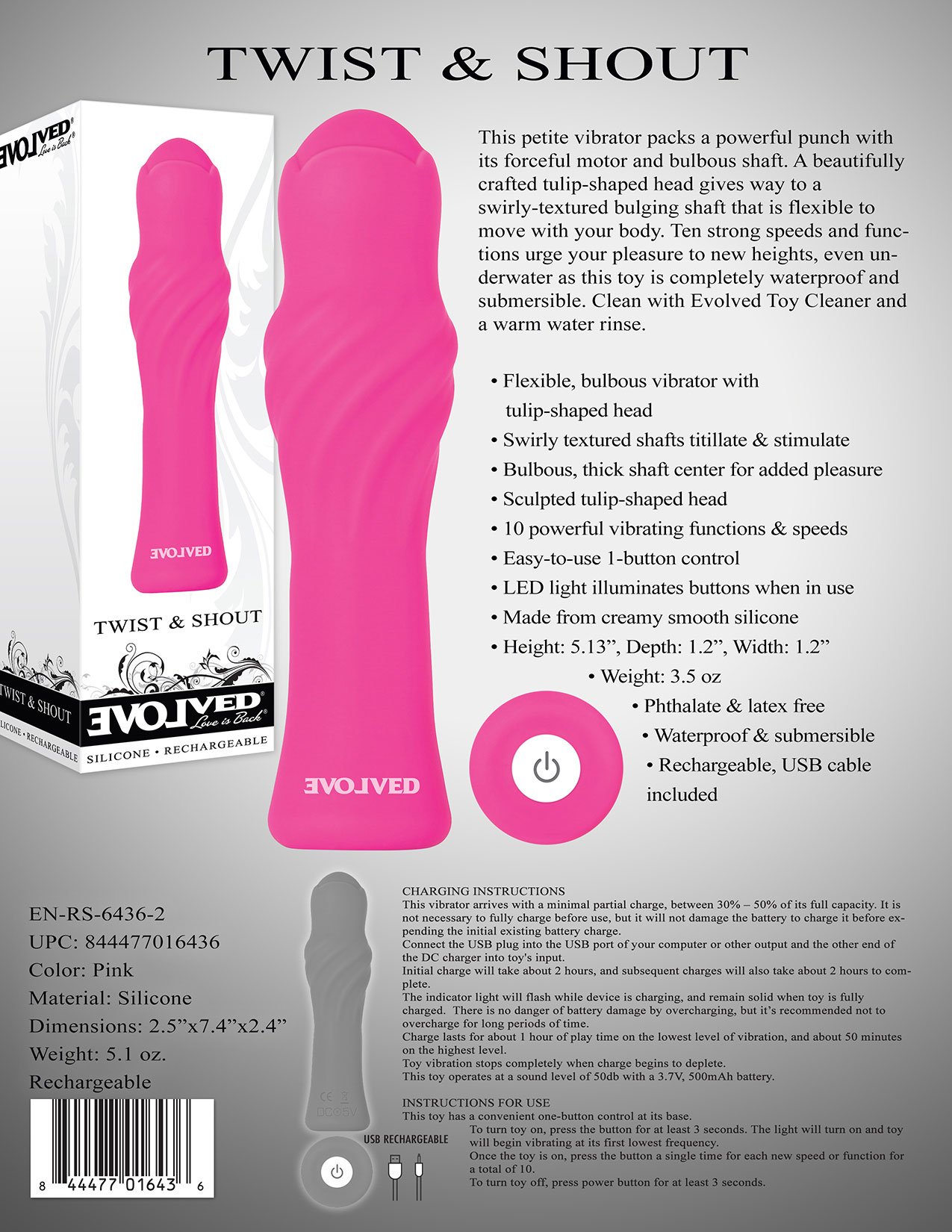 This petite vibrator packs a powerful punch with its forceful motor and bulbous shaft. A beautifully crafted tulip-shaped head gives way to a swirly-textured bulging shaft that is flexible to move with your body. Ten strong speeds and functions urge your pleasure to new heights, even underwater as this toy is completely waterproof and submersible. Clean with Evolved toy cleaner and a warm water rinse.