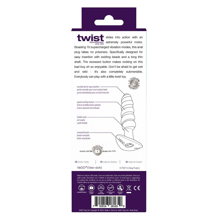 TWIST rechargeable anal swirl slides into action with an extremely powerful motor. Boasting 10 supercharged vibration modes, this anal plug takes no prisoners. Specifically designed for easy insertion with swirling beads and a long thin shaft. The recessed button makes rocking on this bad boy oh so enjoyable. Dont be afraid to get wet and wild its also completely submersible. Everybody can play with a little twist toy.