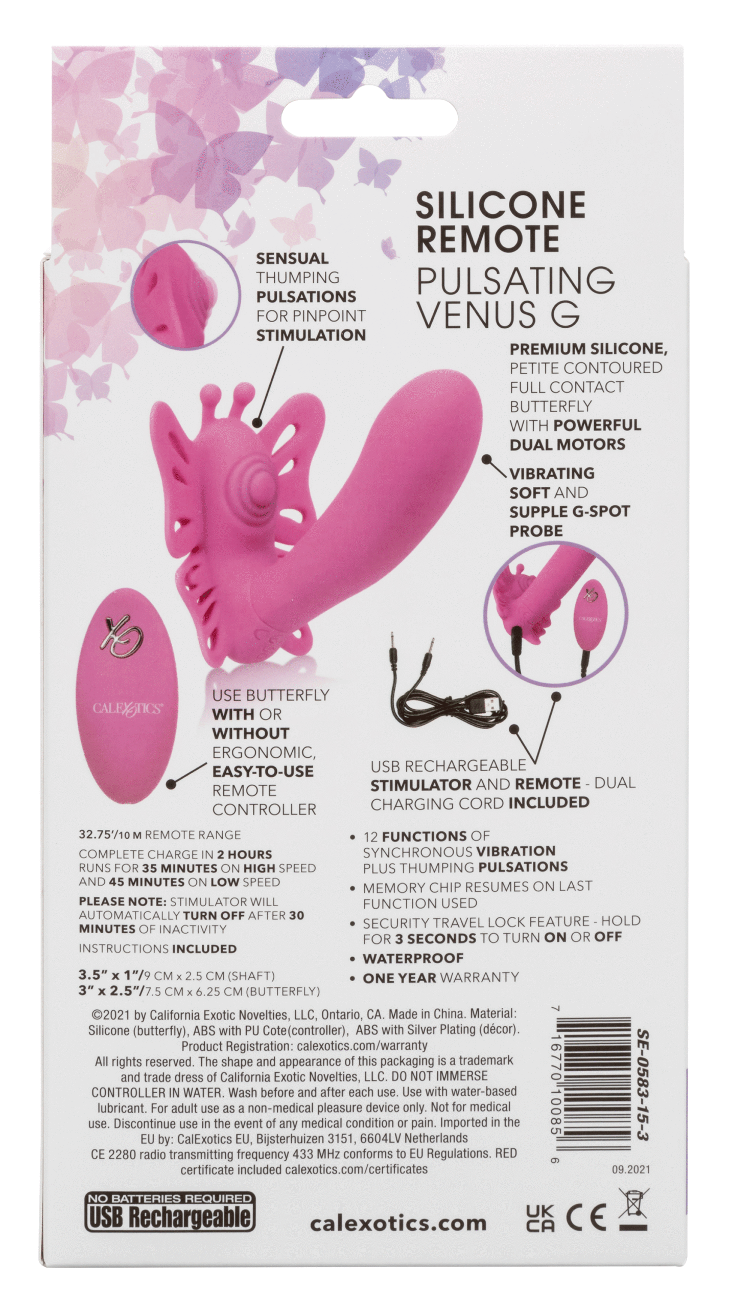 The now world-famous Venus Butterfly collection has done it again with a sensually thumping probe and 12 intense functions of vibration. Spread your wings and tease on-the-go with the ravishing remote control range of up to 32.5 feet away! While the sensually curved vibrator delivers knee-shaking g- spot stimulation, the contoured butterfly hugs close to your body for external teasing. Whether you’re looking to turn up the heat with a lover or just enjoy some sensual solo time, this blissful butterfly is ready. While the curved tip delivers pinpoint thumping sensations with a pulsation tip for powerful g-spot stimulation, the soft pliable butterfly envelops your most intimate curves to deliver blissful external pleasure. To use with the remote, hold the push-button control for 3 seconds to turn on/off and use the XO button to cycle through 12 vibration, pulsation and escalation functions. While the easy to use vibe can be used with or without the remote to control the intensity, the integrated state of the art memory chip remembers just how you like it by starting on the last function used. Recharge the premium silicone massager in 50 minutes with the provided dual charging USB cable to enjoy 35 minutes of high-speed stimulation or 45 minutes of low speed vibrations. Massager will automatically turn over after 30 minutes of inactivity. The hypoallergenic premium silicone is body safe, unscented and phthalate free to keep your most sensitive spots, happy and healthy.
