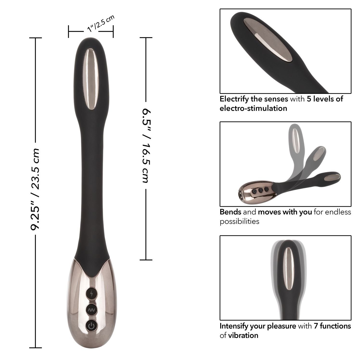 Embrace full-body stimulation with 7 functions of vibration and 5 independently controlled e-stim functions. The sleek 3-button control pad lets you enjoy frustration-free control. The flexible massager is made from a hygienically superior silicone. This body safe material is unscented and phthalate free to keep your most sensitive spots happy and healthy.