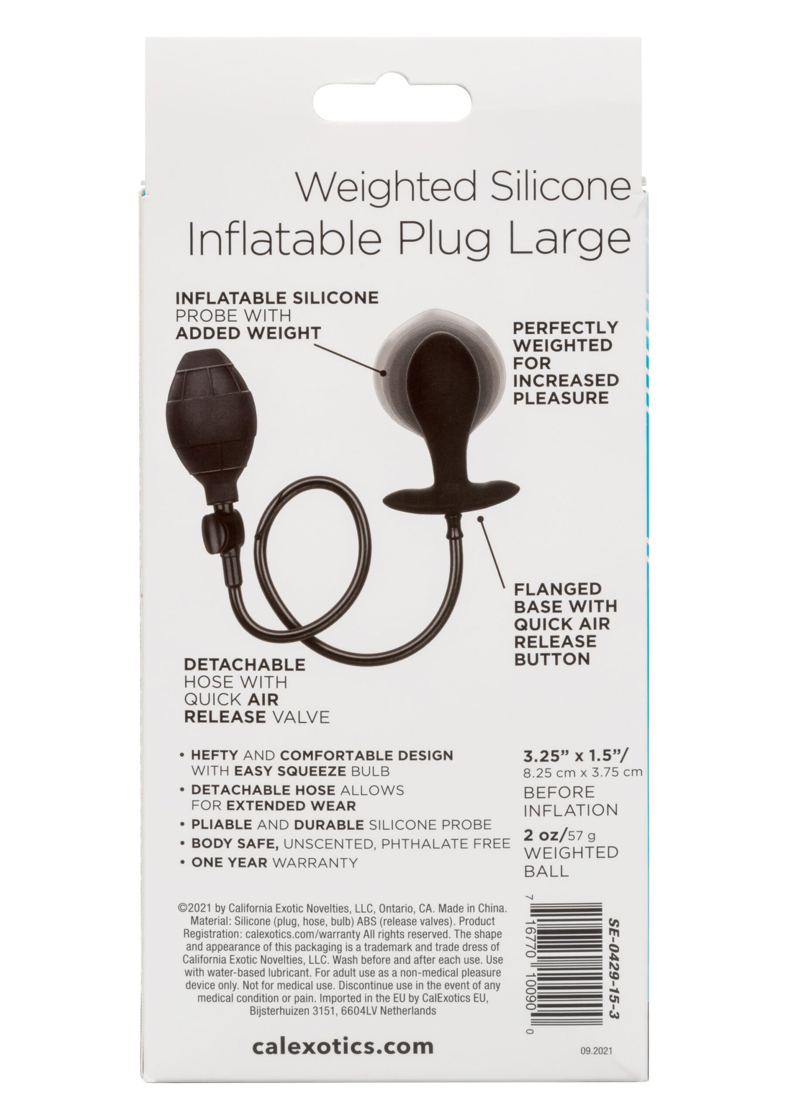 The CalExotics Large Weighted Silicone Inflatable Plug is a one-of-a-kind anal probe with inflatable weighted body, easy squeeze bulb and detachable hose. For increased pleasure, this plump probe is perfectly weighted with a 2 oz ball. To inflate your exstasy, simply attach the hose and press the easy squeeze bulb. Once you’ve reached the desired size, the probe will hold its size even when the hose is removed. A quick air release button allows for gentle deflation and removal.