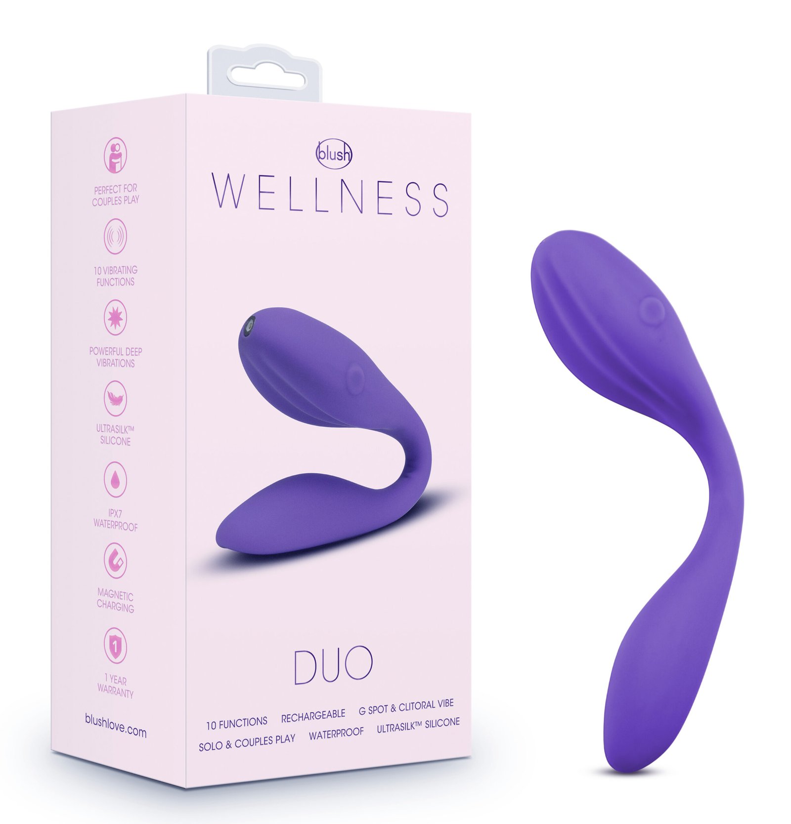 Ideal for solo play, ideal for partner play: the Wellness Duo is a versatile couples vibrator. Its flexible body will bend with yours, for extra G-spot plus clitoral stimulation during penetrative sex. Or, Duo’s 10 powerful functions will shine as you use it as a straight vibe, either inside or outside your body. Duo is rechargeable, plus waterproof submersible for easy cleaning or play in the bath or shower! Ultrasilk smooth and made of puria silicone, the Wellness Duo is body-safe, phthalate free, latex free, and easy to clean.
